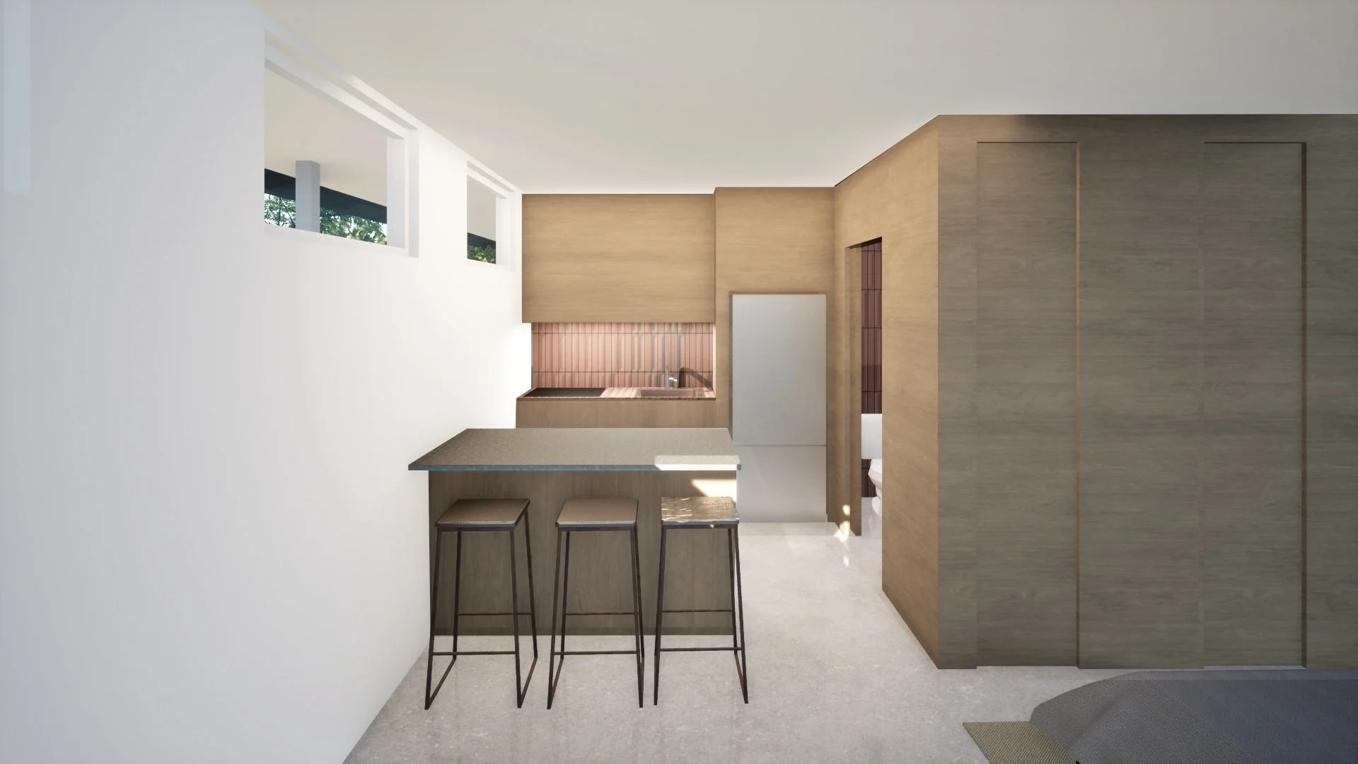 The key factor for this project was to maximize privacy and then integrate space-saving solutions. A closet and kitchen island divide the unit without adding unnecessary rooms to the small footprint, allowing spaces to form without additional partitions. Materials work as a series of planes that expand the interiors of the unit. In the back of the unit, a tile wall forms a backdrop that continues from the kitchen into the bathroom. Placed in front is a wood-paneled box that contains the closet and bathroom, further adding a layer of privacy and dimension.