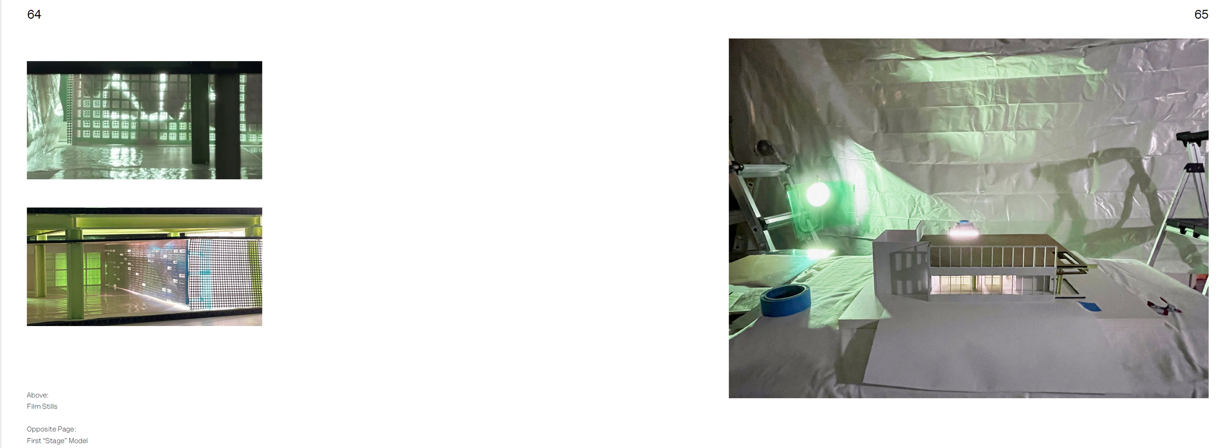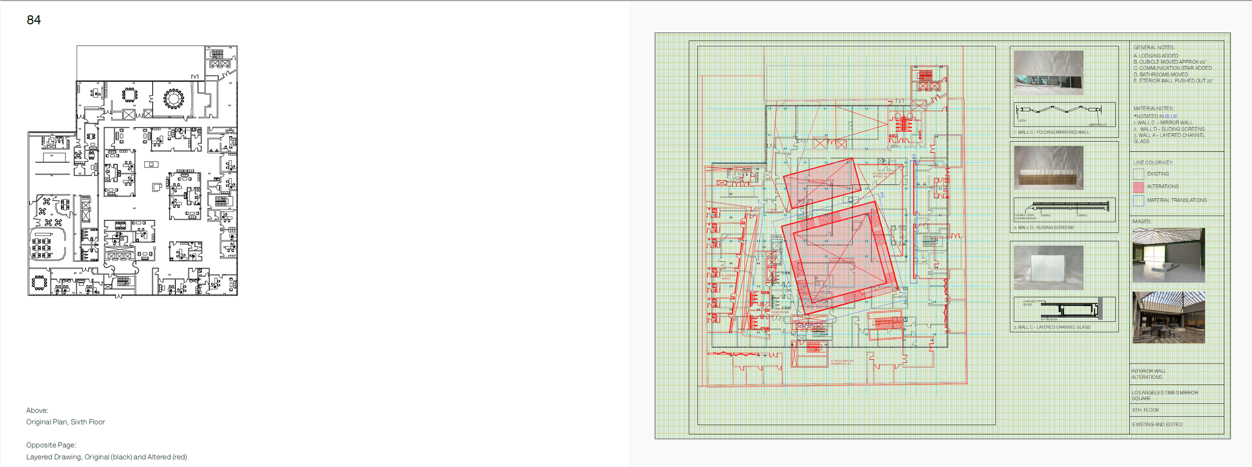 William Pereira’s 1973 Los Angeles Times Building is used simultaneously as a case study and a canvas to reconfigure the news building at both an architectural and programmatic level. The project speculates a mixed architectural typology that integrates public participation into news production. While examining the possibility of the emergence of a new civic building through the concurrence of a news center and fact-checking institution. A thorough investigation of the building was conducted in order to gather an ongoing archive of materials, interviews, and plans that allow for an understanding of the building on multiple levels. Interviews with reporters from the Los Angeles Times and historians specializing in William Pereira were conducted as a means to understand the building and the user’s daily interaction, as well as aspects relevant from a preservationist standpoint. The building becomes the subject of a contemporary adaptive reuse project. Specific rooms are selected, reconstructed, and then altered through demountable physical models – interacted with like stage sets. Each set is filmed, allowing for a recording of alterations, layering and editing to the existing layout. The question of the role between the tabula rasa and tabula scripta arises in where and how to alter the building. Material layering and the movement of building elements allow for certain effects to take place in the physical models that serve as a guide for alterations in the overall project. Transparency through pattern and movement, layered accumulation, atmospheric build-up, and impermanence are the basis of such experiments in effects, while Reyner Banham’s theory of the Kinetic Icon, Andrew Holder’s Sufficient Density, and Hilary Sample’s Maintenance Architecture function as backdrops to the resolution of the exterior and interior convergence.